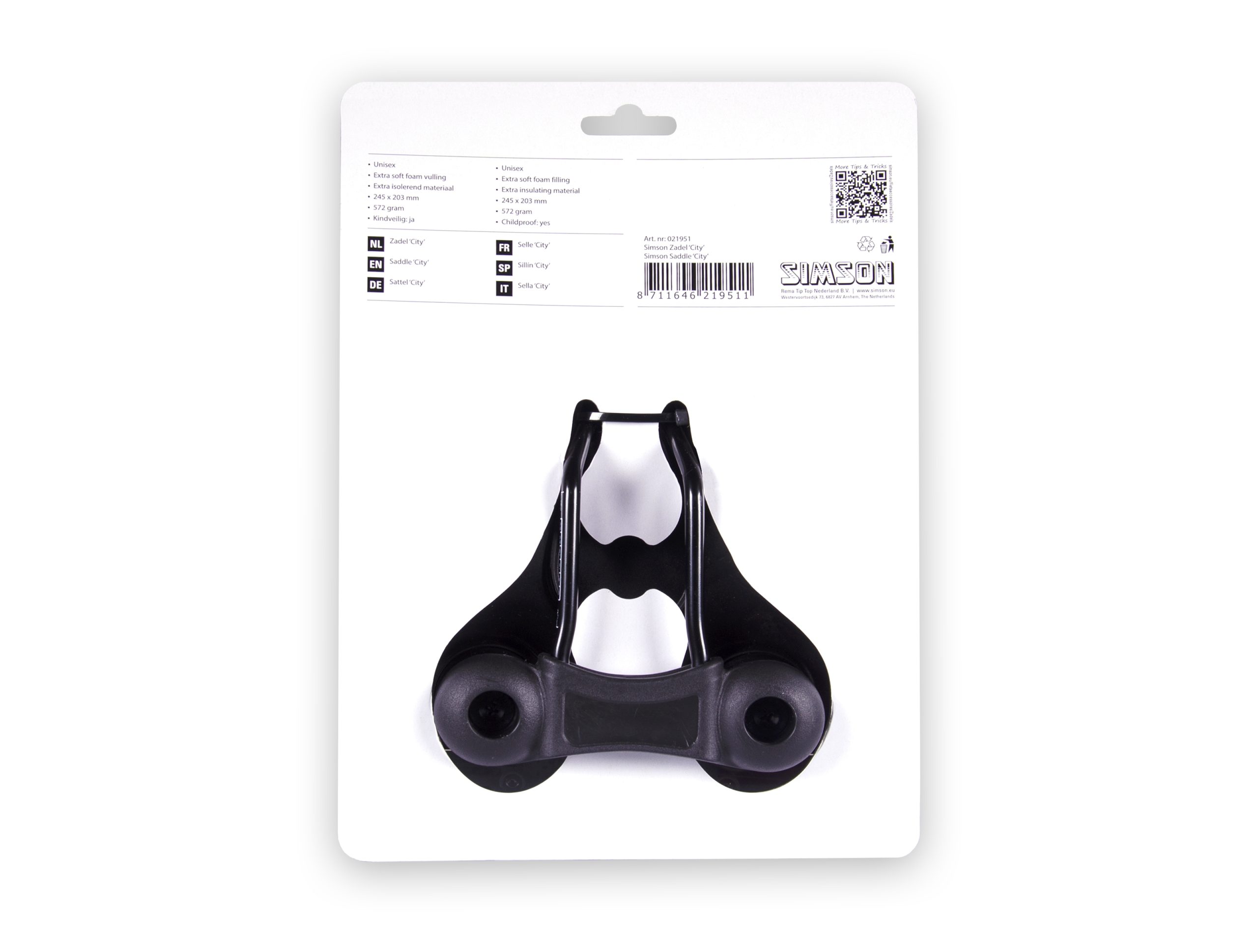 Het Simson zadel City is een universeel zadel gevuld met een extra comfortabele soft foam vulling wat zorgt voor nog meer zitcomfort. Het extra soft foam heeft tevens een verhoogde isolerende werking, wat ervoor zorgt dat het zadel bij koude temperaturen weer snel warm wordt tijdens het fietsen. Het zadel is zeer geschikt voor fietsers die kinderen achterop vervoeren, omdat er geen onderdelen (zoals veren) aan het zadel zitten waar kinderhanden zich aan kunnen bezeren. De opstaande kunststof rand rond het zitvlak zorgt ervoor dat het zadel tegen een stootje kan. Het Simson zadel City heeft een lengte van 245mm, een breedte van 203mm, weegt 572 gram en is zwart van kleur. Produktdetails: